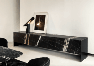 Protagonista in una delle tre vetrine, una ‘white box’ che accoglie l’iconica chaise longue La Grande Muraglia Outdoor in marmo Statuarietto, accompagnata dalla lampada Lentein Absolute Blacknella versione da terra e in Statuariettonella versione da tavolo.