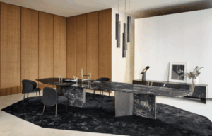 E ancora, le lampade Strobiloed Eosaggiungono un accento luminoso, valorizzando le superfici e amplificando il carattere scenografico dell’allestimento.