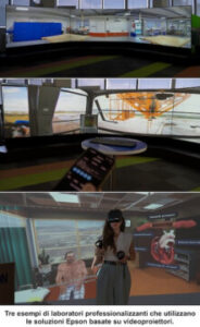 – IPWLab (Immersive Projection Wall): è un sistema formato da tre proiettori a ottica ultra-corta EB-815E con schermi ALR da 120 pollici, per un ambiente altamente coinvolgente. Si presta in modo significativo alla simulazione di laboratori virtuali nelle scuole professionali e negli istituti tecnici, permettendo agli studenti di “entrare” in scenari professionali realistici senza la necessità di attrezzature fisiche costose o pericolose.