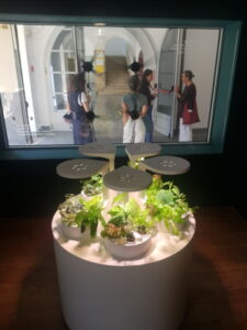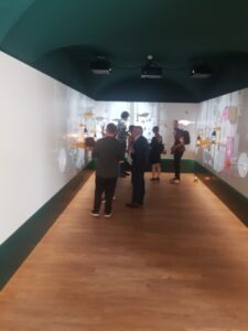 Una vetrina garantisce la visibilità del laboratorio anche dall’esterno, e ospita al suo interno quattro eliche olografiche che proiettano in 3D uno stormo di uccelli, perfetta metafora di un sistema naturale apparentemente caotico ma governato da regole condivise.