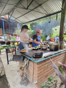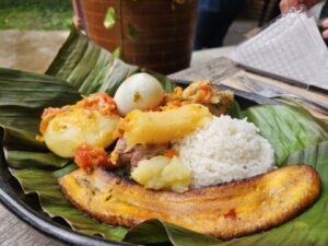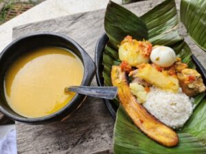 Per pranzo sempre a Salento, in località Villa dei Fiumi abbiamo assaggiato , in una casa privata, un piatto campesino servito su una foglia di platano composto da riso, fagioli, carne trita, uovo sodo, salsiccia, avocado e platano ,servito oltre ad un ottima zuppa di zucca.