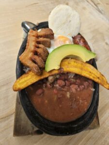 Sempre nella zona dell’Eje Cafetero in località Salento, ( hanno nomi strani questi luoghi come Antioquia, Armenia, Filandia, Pereira, e uno italiano appunto) al Ristorante Donde Laurita, abbiamo invece assaportao una Bandeja Paisita a base di di riso, chorizo, fagioli rossi, carne sfilacciata , uovo al tegame, salsiccia e avocado, platano e pancetta.