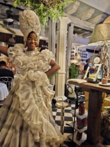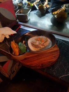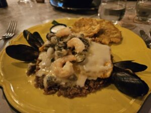 Un filetto di pesce della Negra Candè. Con pesce di stagione ( orata) con salsa di cocco stile Cartagenas con gamberi , calamari , accompagnati da cozze e vongole e servito con riso nero e platano. Un piatto di langostine con granchio gratinato, servito con puré di igname o patata dolce e formaggio locale. Il tutto con tanto di spettacolo di danze e musica caraibica.