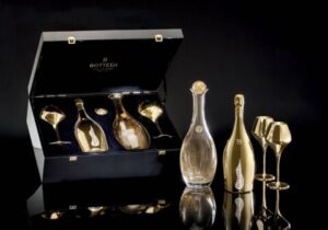 • Una bottiglia in vetro soffiato di Murano, realizzata su misura e impreziosita da foglia d’oro sommersa, con tappo sferico coordinato. Si tratta di un capolavoro artigianale dal peso di 4 kg, nato dalla collaborazione tra Bottega e il maestro vetraio della Soffieria Pino Signoretto. È stato realizzato a mano nella fornace sull’isola di Murano, utilizzando le tecniche uniche e artigianali della lavorazione artistica del vetro muranese. Ogni bottiglia è numerata e firmata da Sandro Bottega, artefice del disegno originario. Si tratta pertanto di un pezzo unico, da utilizzare tanto come decanter per servire il Prosecco quanto come oggetto d’arredo, per il design elegante che lo contraddistingue.