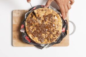 Cuocere in forno caldo a 180° per circa 40 minuti. Togliere dal forno, togliere dallo stampo, adagiare la torta su un piatto da portata e servirla dopo 10 minuti. È possibile servirla anche a temperatura ambiente.
